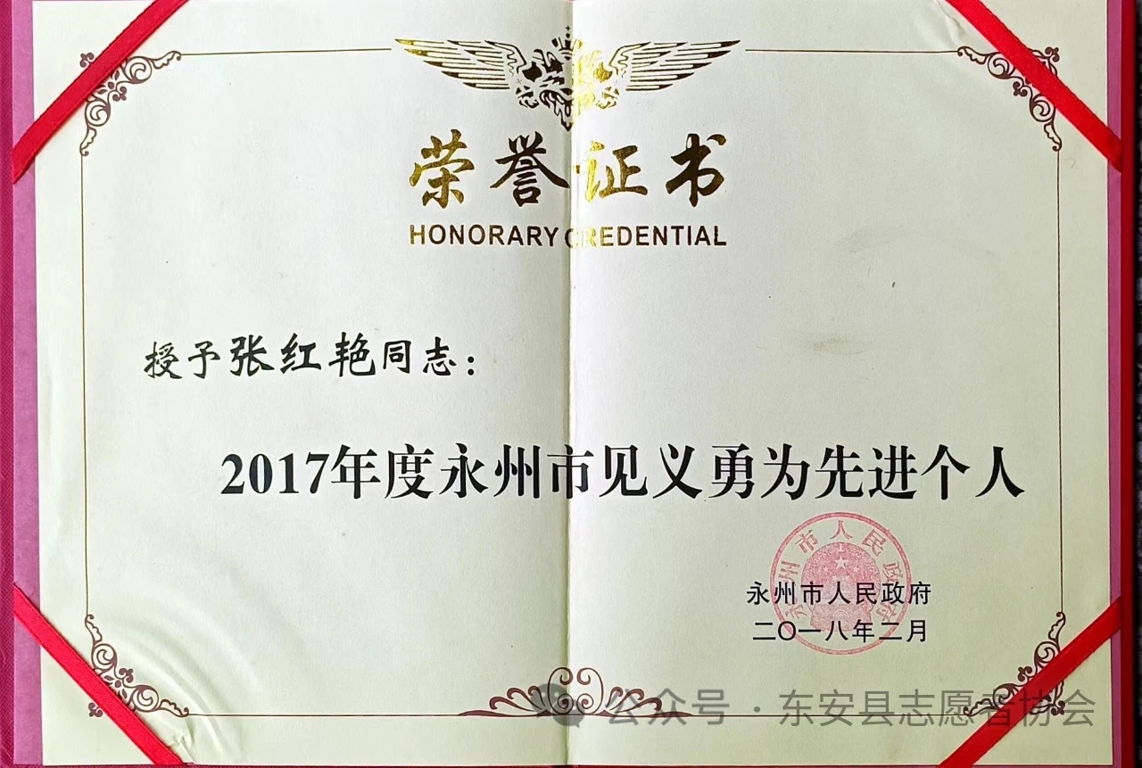 2024年1月6日,在深圳建辉基金会、永州博睿社会服务中心、东安县志愿者协会三方爱心接力下,展开了一次特别的爱心慰问活动,根据协会活动安排,派出6位志愿者前往芦洪市镇慰问见义勇为好人张红艳,弘扬她舍己救人的英勇精神,更彰显了这个世界处处有爱。事件回放:张红艳曾是洛湛铁路义务护路员,2017年10月18日15时31分,芦洪市镇中心小学三年级同学陈小玉在回家的路上横跨铁路时,列车呼啸而来,在这千钧一发之际,张红艳冒着生命危险,把她从铁路上救下,孩子没事了,而张红艳身体多处受伤严重,张红艳先后被东安县和永州市授予“见义勇为先进个人”荣誉称号。