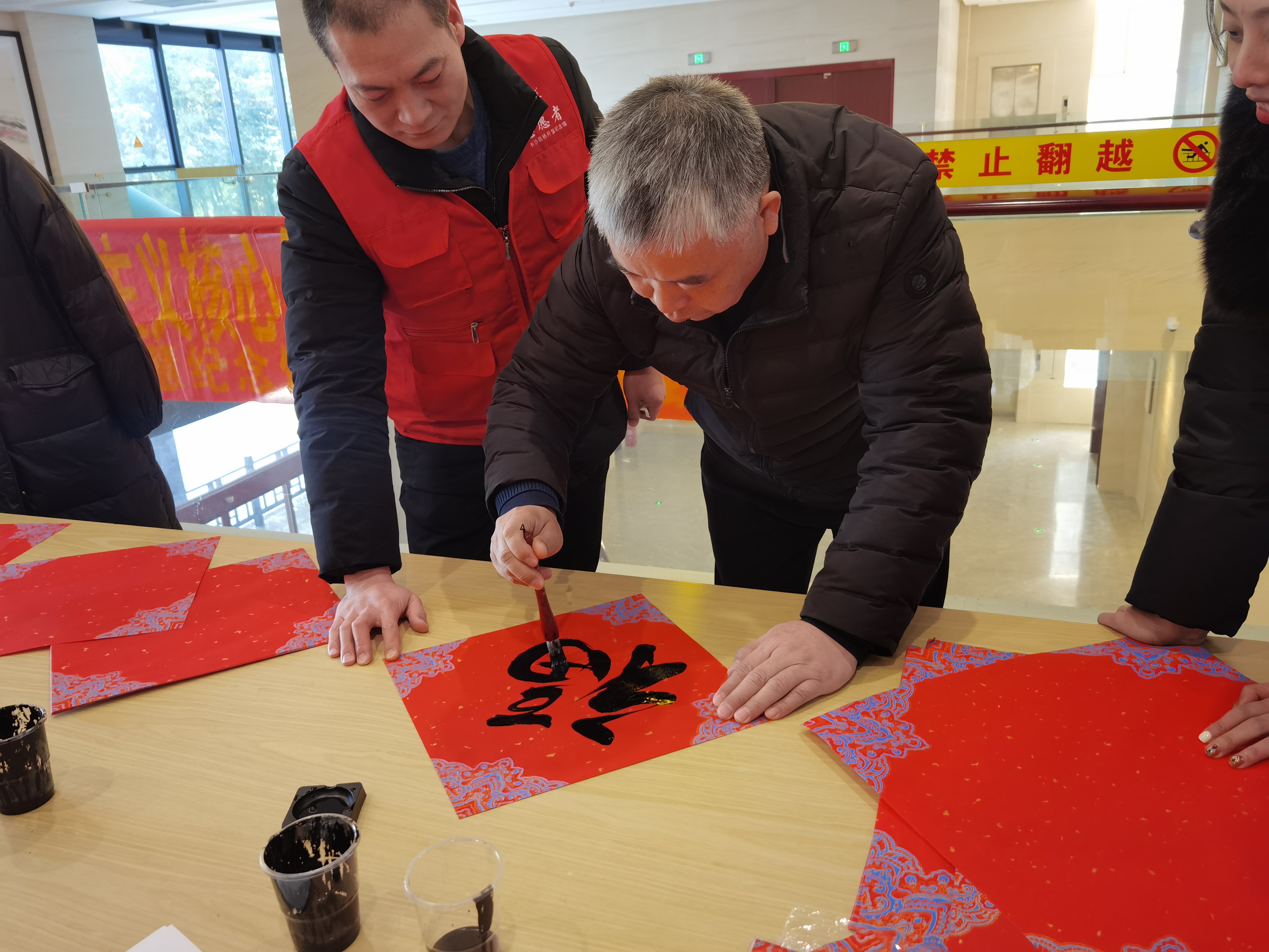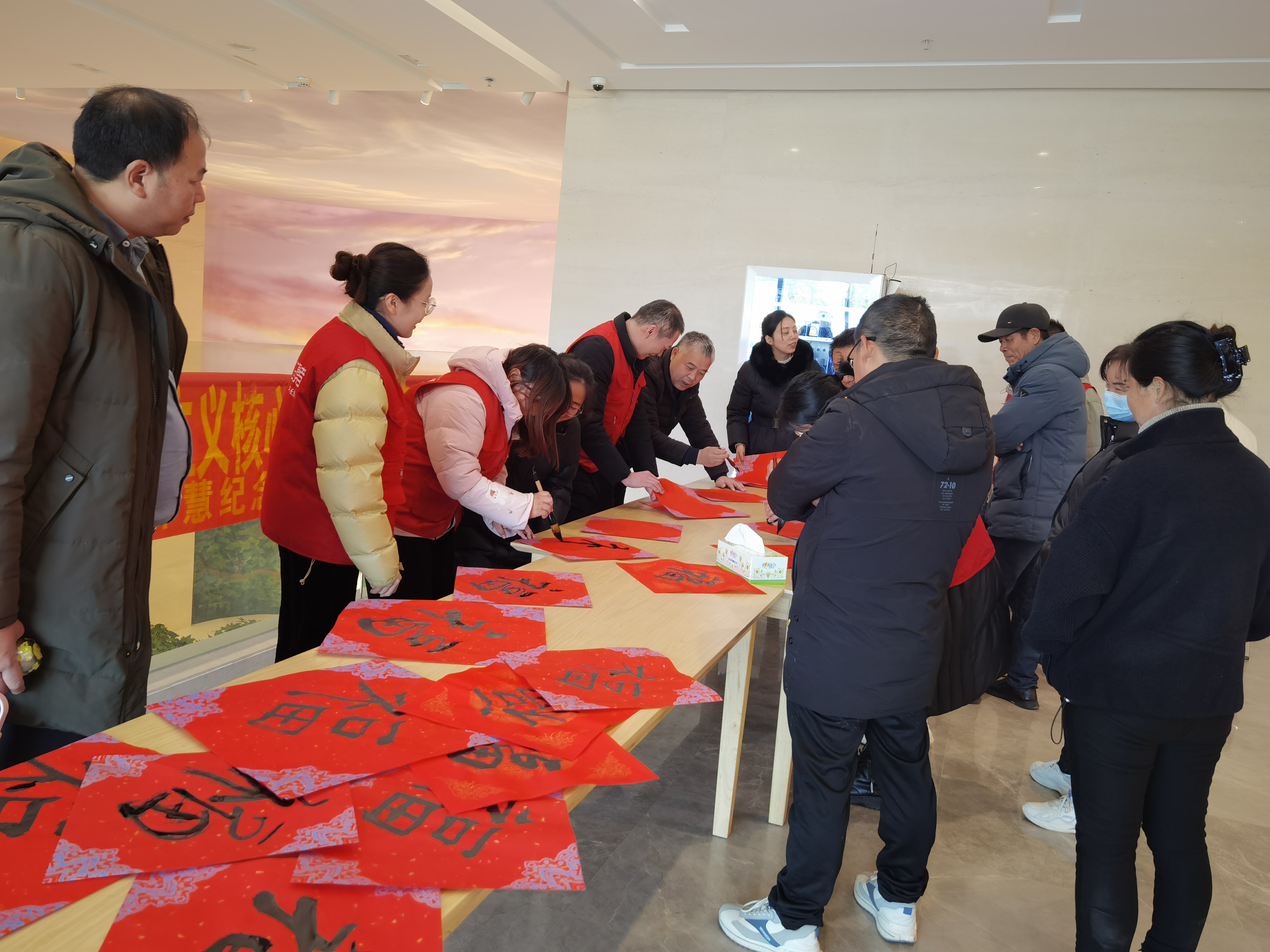 当天下午2时许,志愿者们早早布置好了场地,准备好了红纸、笔墨,短短时间,现场墨香四溢,人头攒动,吸引了大量游客参加。书法爱好者们纷纷铺纸蘸墨、伏案挥毫,神情专注地写下一张张透着喜庆、祝福的“福”字。